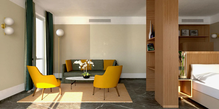 Each room and each suite has been individually managed, composing a very refined and “tailor-made” interior design depending on the location of the space, the light and the view from the windows.