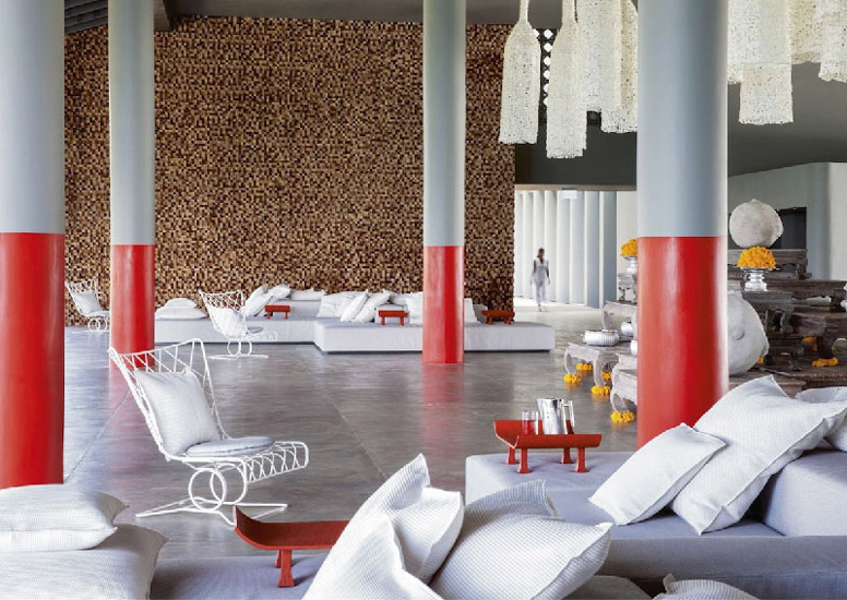 For the interior design of the Yamu Resort by COMO in Phuket, Navone sourced everything locally including the wooden furniture made by artisans in the north of Thailand. She also incorporated oversize graphics that resemble ancient Thai language symbols painted in white on the ceiling of the lobby bar.