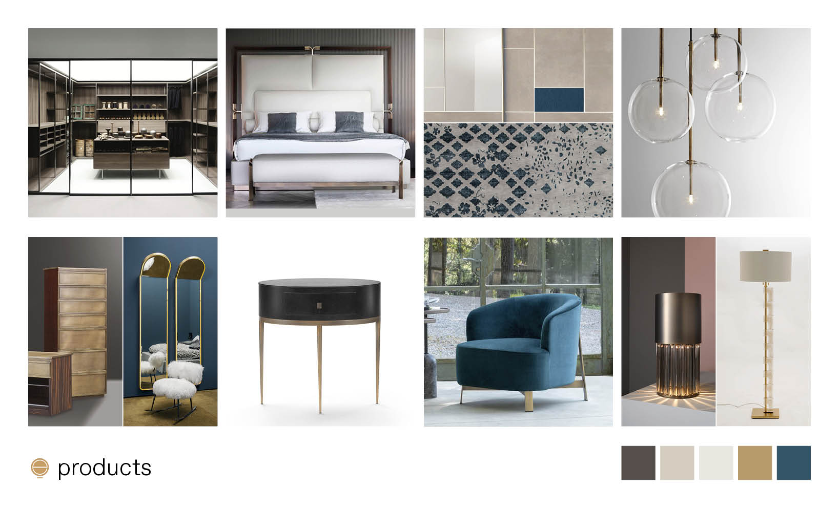 Brass, in addition to the profiles of the bed, is also found in other furnishing elements, such as the slender legs of the Romy bedside tables by Mood by Flexform, the high Orione dressers by Promemoria, the frame of the Stardust mirror by Baxter and the metal frame of the Copine armchair by Porada in blue velvet.
