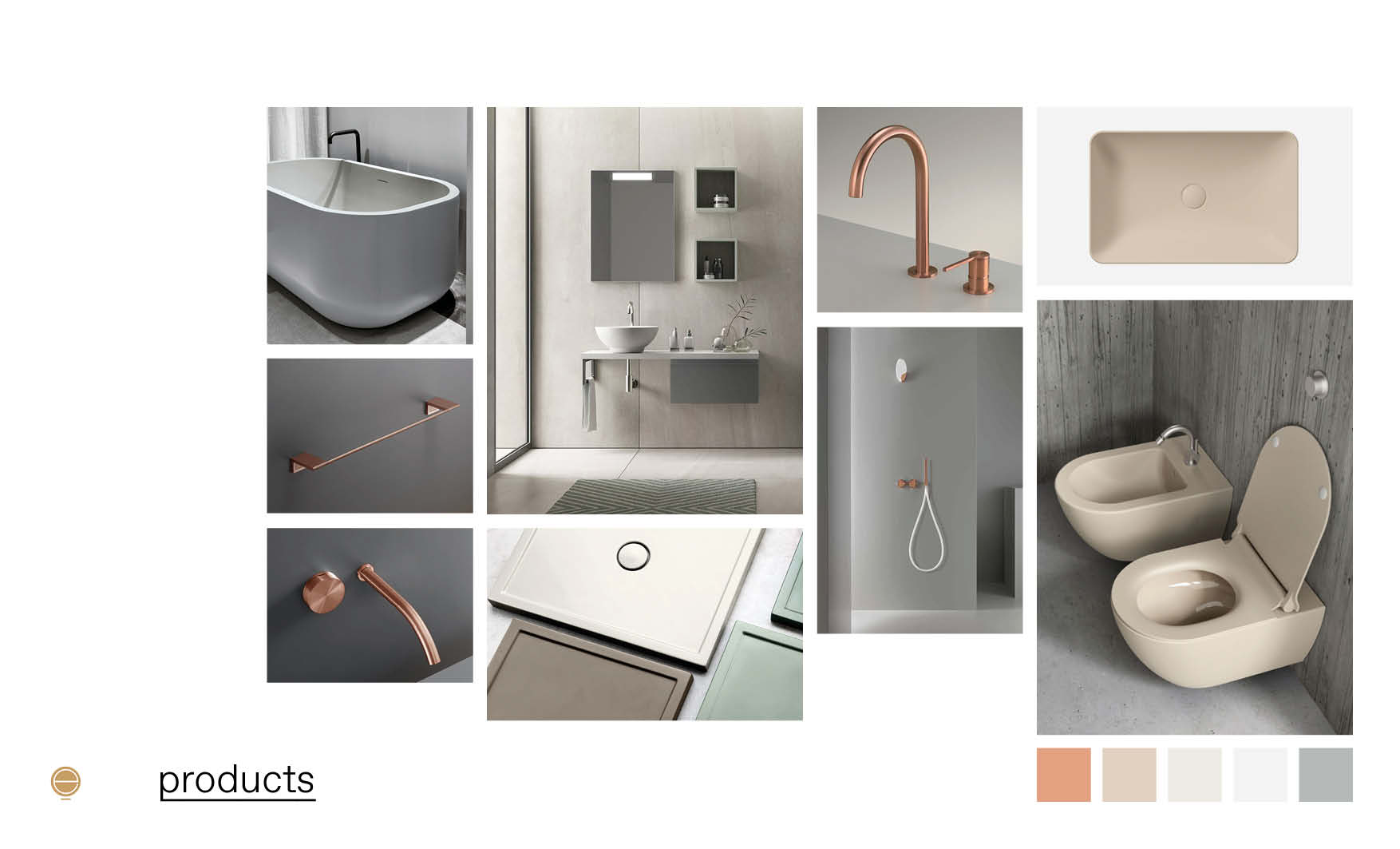 Copper & Ivory, Black & White, and Shades of Marble are our three proposals. For each one, we created mood boards with products, materials, and finishes, each with a different price positioning.