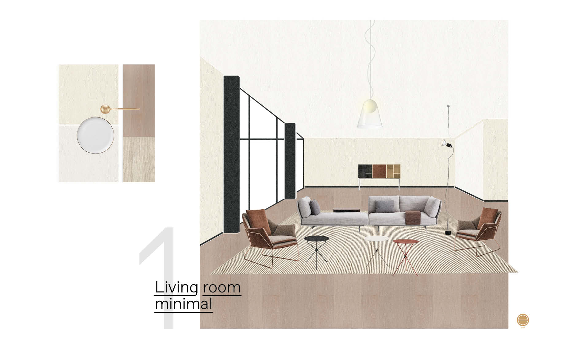 As previously mentioned, the minimalist style lies in a constant search for cleanliness and simplicity. Our first proposal is the most essential: the painted white and cream walls highlight details such as the wooden floor, the moldings, and the different textures present in the furnishing elements. The hues of the fabric upholstery, the metallic details, and the lines of the coarse wool of the carpet that intersect with the patterns of the wood floor seem to constantly play off one another.